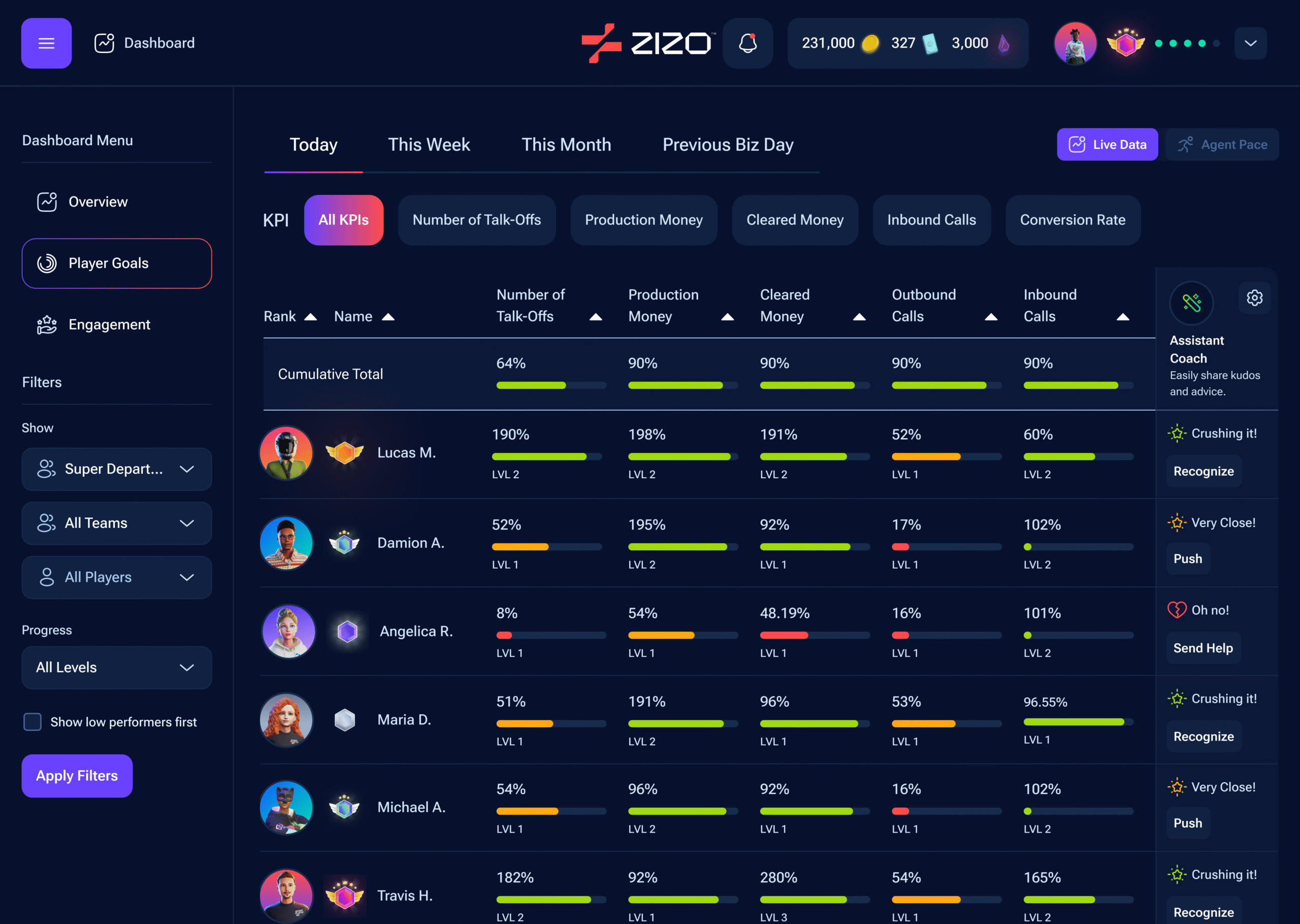 ZIZO combines real-time performance intelligence with science-backed motivation techniques to help call centers and high-performance teams achieve unprecedented levels of engagement and productivity. See why companies are reducing turnover by 30% while boosting performance by up to 96%.